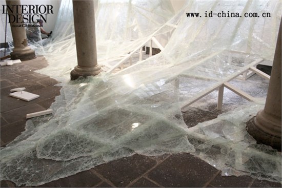Debombourg 偏爱普通的材料,在这处艺术装置中玻璃这种材料“很快就突显了出来”。他所指的是教堂庄严的窗户,光线透过玻璃所产生的效果,以及打碎的玻璃所具有的象征意义。他说:“吸引我的不是打碎的玻璃中所蕴含的暴力意义,而是随后的治疗过程,在暴力发生之后的康复。”他和8 位助手一共打碎了重达2 吨的多层玻璃,使用榔头、大锤、破冰锤,还要带上特制的手套。他们随后将打碎的玻璃铺设到用云杉木做成的框架上,框架被涂成白色。最后一步是使用几乎无法看到的白色钉子将玻璃固定住。完成之后的作品 Aérial,其玻璃表面在阳光的照射下闪闪发光,就像是巨大的历史波浪穿过窗户喷涌而出。 - Judy Fayard