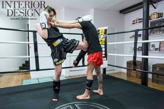 由于泰拳馆处于建筑的内部,没有自然采光,所以Spray为其设计了一个玻璃屋顶,将自然光引入室内。阳光透过玻璃屋顶照射进来,为学员创造了一个温暖舒适的环境。而接待室的地面采用烤漆地板,烤漆地板不仅硬度高、耐磨性好,而且外观光洁。考虑到与上面的玻璃屋面相呼应,Spray还将其喷成白色或者黑色的三角形状,极具观赏价值。