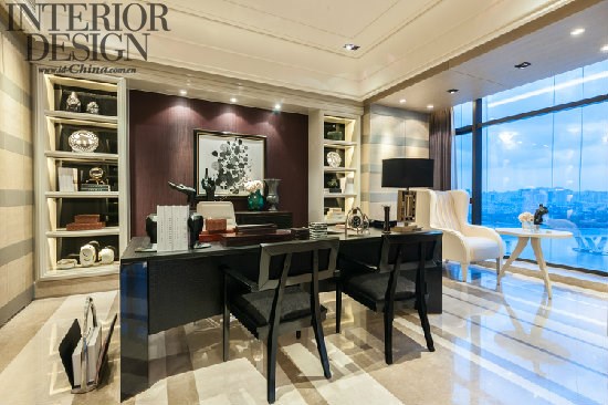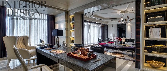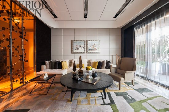 邱氏住宅设计,惯常使用明亮厚重的颜色产生对比。本案却大量采用了浅色系,加之大面积的窗景,让空间明亮度得以提升。客厅是主人招待来宾的场所,也是展现其品位的重点空间,因此除了在功能上要符合生活所需,设计师在家居布局上也搭配出一种丰富的语言。把书房与客厅融合在一起是近年住宅设计的一个重要趋势。本案设计师仅以一扇推拉门将两者隔断,既保留了私人空间的独立性,也扩充了公共空间的视野宽度。
