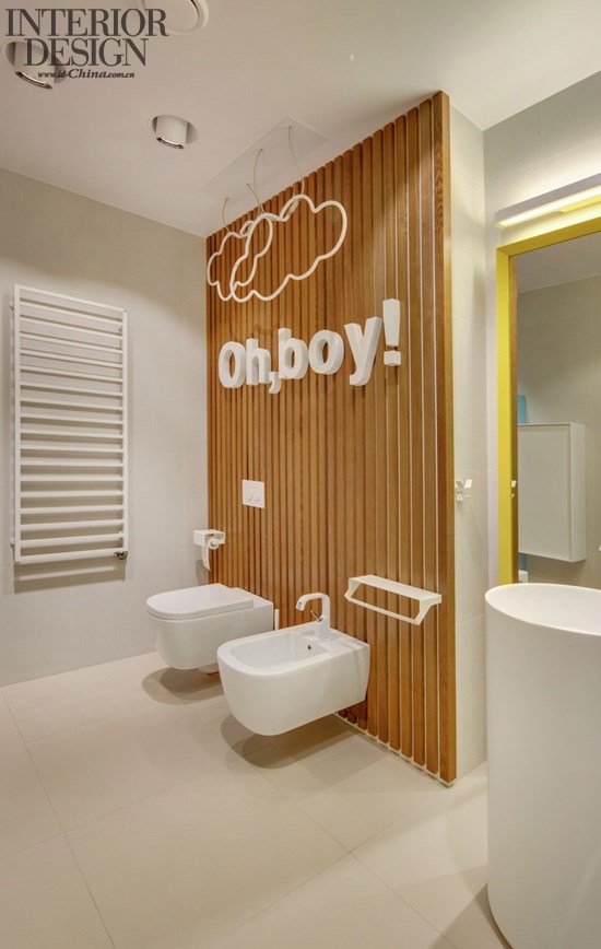 接下来是浴室和洗漱间。两处设计很能看出设计者的心思,其一是为小孩设计的洗漱池,洗漱池上方有两朵白云和“Oh,boy!”的字样,另一处设计是在浴室中,墙面是一处草原的景象,在镜子的反射下草原被放大了一倍,使人感到辽阔,心境悠远。