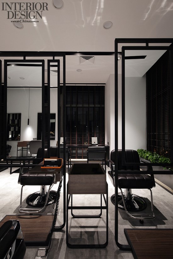 空间与物件与人的对话,是场景的情绪所在,白天室外的油绿树木在作业过程中被充分享受,依窗而设的一字吧台不再是单纯的染发桌,入座轻松、宁静,亦成为等候的绝妙区域。夜晚,街景的霓虹靓影在环绕的百叶中忽隐忽现,黑色隐匿的神秘在空间中渐渐染开……