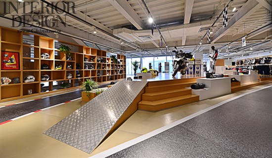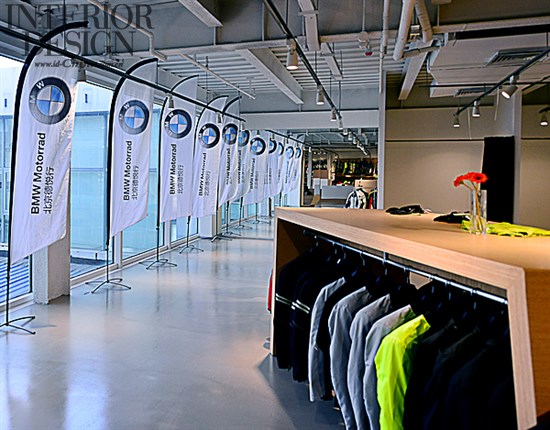 进入展厅的第一个视线焦点是悬吊在5米高天花上,长度25米的超大半透明印刷喷绘。通过内置LED灯具,使前后三层交错排列产生虚实交汇的效果。影像从城市到大自然,寓意宝马骑士精神无所不在。也传达摩托车冒险精神给客户。在展示区最多可以同时展示十七台新款摩托车。