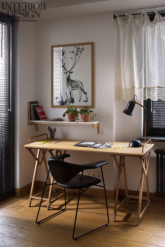 黑白颜色的对照呈现于公寓的设计主调中,黑色的皮革和白色的亚麻布形成鲜明的对比,带来清爽干净的感觉,与此同时,木材的纹理有助于温暖黑白色家具,又让人感觉清晰和简洁。“麋鹿公寓”并没有投入繁复的色彩和过多的精雕细刻,细看之下却也不乏一些迷人的细节,比如窗帘结合了玫瑰蕾丝花边,还有垫子上的丝带,一方面展现出现代风格,另一方面点缀得室内空间如同一位优雅、有品位的女士。设计装饰中最具艺术风格的元素当属客厅和书房里悬挂着的麋鹿绘画,基辅艺术家Katya Berlova以细腻的手法勾画出一只栩栩如生的鹿,生动得仿佛就要从画板上跳跃出来了,同时外边以橡木框装裱,显得十分精致典雅。