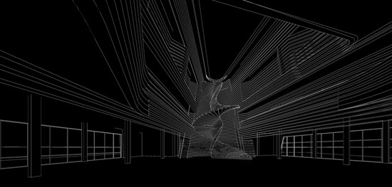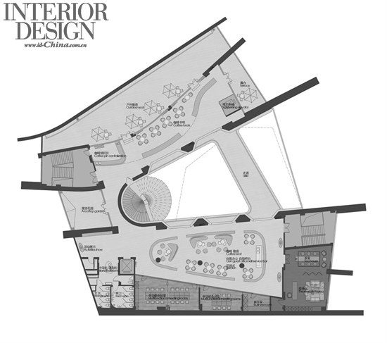 中央大厅的顶面,原建筑为玻璃屋面,为了减少能源损耗,采用大面积的双层柔性发光膜来做顶面设计,白天可以过滤掉部分太强的自然光,室内也不至于很暗,晚上利用人造光营造出柔和的顶面发光体,让人有一种要冲到顶面的欲望。蔚蓝的大海、洁白的旋转楼梯两厢完美结合,缔造出时尚简洁之美。