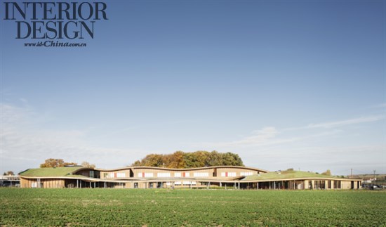 利用场地的自然形状,建筑规模及其波浪型的外观从视觉上消隐在绿色景观中,与环境合二为一。被植被覆盖的屋顶具有良好的散热作用,它在木质结构表面延伸并将其包裹起来形成一个保护性的顶篷,就如同一个森林模拟系统,师生们自由穿行在这充满绿化的空间之中。