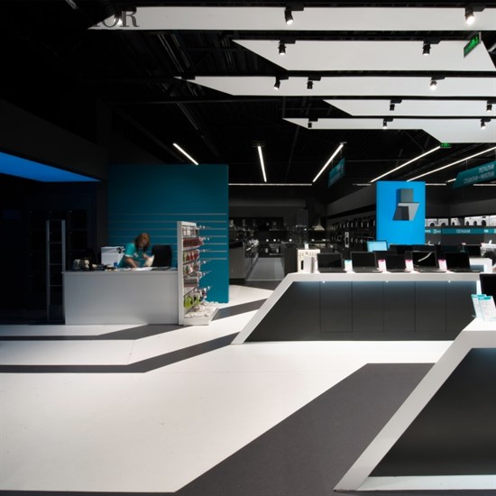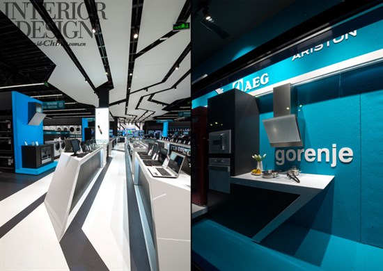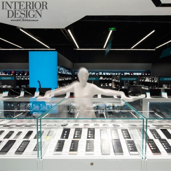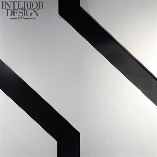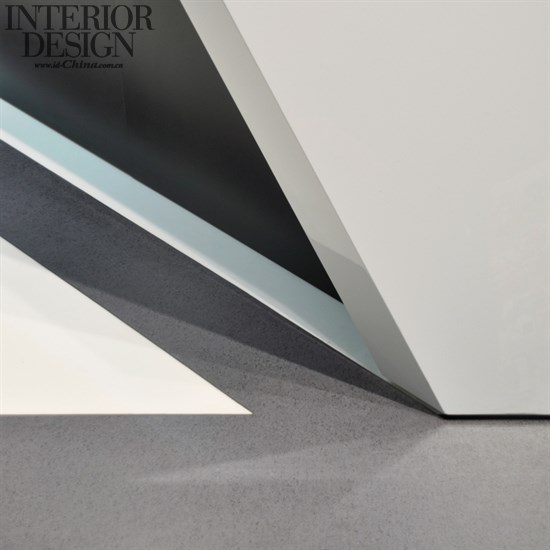 中心产品展示区的设计有别于周围的展示区,当中的差别首先反映在色彩上,其次是表面的材质,再次还有灯光照明。设计师主要运用黑色和白色于中心区,以最经典的配色方案制造鲜明的对比。黑色粗线条以稍作曲折的方式从地面一直延伸到墙上,而到了天花处则转化成其他形式继续延伸并与地面对照呼应。白色天花板的特点在于不规则板块之间的空隙,被设计师巧妙地想象成地面黑色线条的延续,放眼望去,纵深感尤为强烈。三列产品展示台演变成曲折线条的三维立体形式,开端处的非直角设计突出个性,增强了空间的透视,又有时空穿梭机的即视感。天花板的空隙处安装着小射灯,点点灯光令产品熠熠生辉,如同太空星际,衬托出整个空间的科技特质。