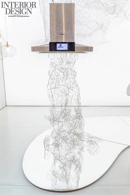 油烟机的巢穴状金属环仿佛是湖泊上腾起的水雾,超强的老板大吸力油烟机将其抽吸上来,过滤为洁净的空气,排上蓝天,幻化成一朵朵云。
