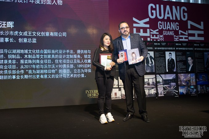 获奖者长沙市虎女成王文化创意有限公司董事长、创意总监汪晖与颁奖嘉宾ICC瓷砖总经理汉贝托