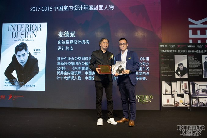 获奖者创达维森设计机构设计总监麦德斌与颁奖嘉宾ICC瓷砖副总经理兼国内营销总经理区波成