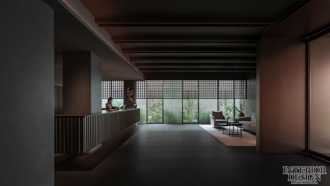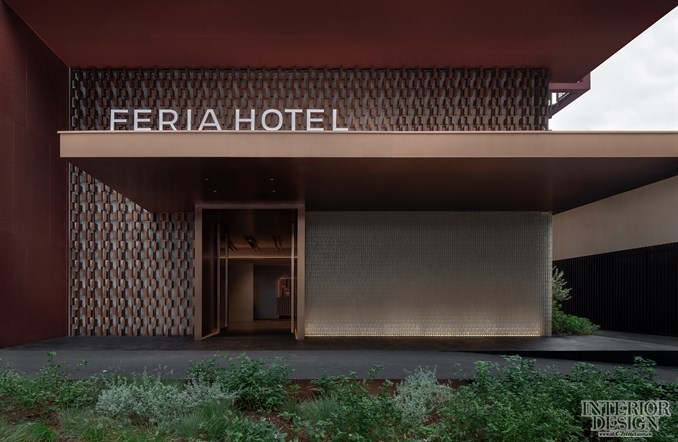 原建筑立面凌乱,设计以极简几何嫣红格子框架包裹建筑,形成完整形态,实现轻改造。醒目的嫣红色使酒店在绿意中跃为焦点。与此同时,原外墙扩大窗洞,覆以灰白涂料形成中性通透底色,与嫣红框架和谐搭配。入口以大悬挑不锈钢雨棚创造视觉张力,辅以玻璃砖墙与方格铝型材,形成丰富的材料变化与视觉平衡。低矮灌木丛点缀其中,为入口注入盎然的生机。