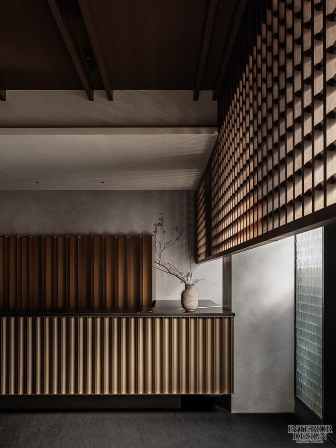 受限于产权条件,首层大堂空间局促且直面西晒与杂乱街景。设计采用先抑后扬的手法:入口面以实墙隔绝干扰,仅留通透玻璃入口,并借南向窄庭引光造景。客人进入后,视线被引向纯净边庭,空间层层递进。超长前台成为核心视觉元素并增强空间纵深感。木格栅、玻璃砖与光影交织,配合简约家具与干枝,营造静谧雅致的氛围。
