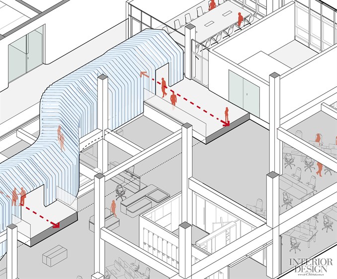 会议区通过低垂的云梯拾阶而上,白色线性元素模糊了天花板、墙壁、楼梯,将常规要素一体化,创造打破常规创新的空间氛围。