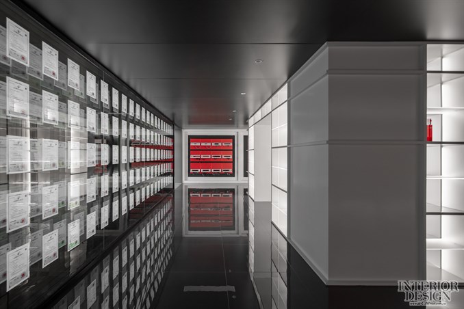 不同于一层展厅的空间并置,二层展厅则采用时间为线索,荣誉展厅仿佛一座黑盒一般收纳了企业过去的荣誉。