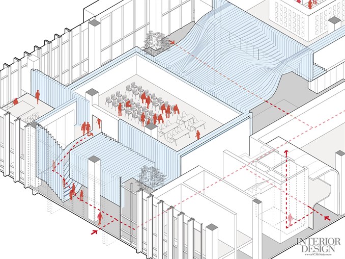 在中庭中央,建造了一座贯通两层的巨型云梯游廊,模糊两层办公区的界限。游廊两端为两座讨论区,茶水间,打印室,讨论区围绕楼梯布置。