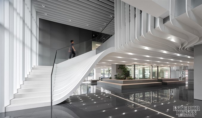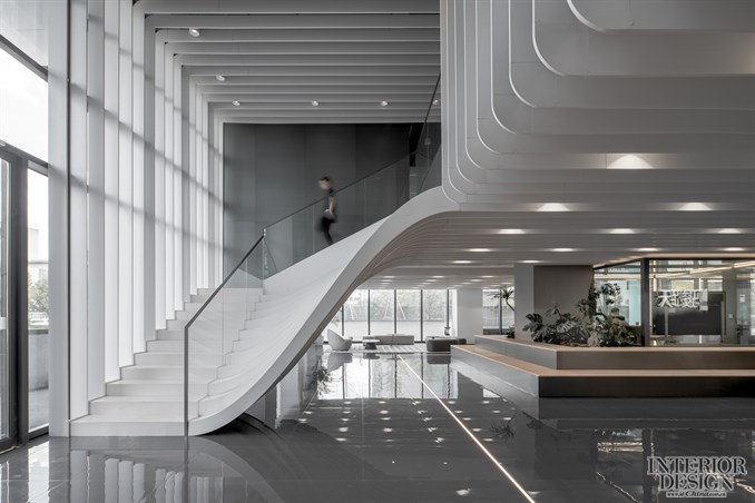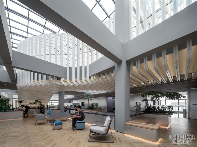 总部建筑是较为常规的框架结构,活动与视线被楼板隔断。设计团队重新梳理流线,创造中庭,模糊墙体、楼板、屋顶的区隔,打破层的概念,用白色曲线将多层空间变为连续的立体空间,带来犹如在云端漫游的轻盈体验,形成耳目一新的总部空间。