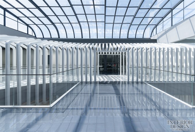 入口大厅围绕一座两层高的中庭展开,设计用低垂的卷积云,将中庭两端的展厅与会议区连接到一起,洁白如雪的云朵从天花板上缓缓垂下,丝丝缕缕,如轻纱般飘逸,形成大尺度环抱式的标志性整体形象。