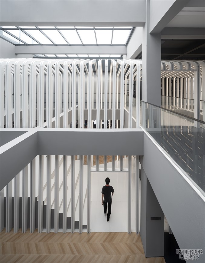 云梯采用竖向白色要素构成,阳光洒在格栅之上,形成明朗,秩序的空间感,随着日升日落,景象随之不同,让员工得以在工作间隙让头脑彻底放松,也成为企业独一无二的标志性的身份特征。