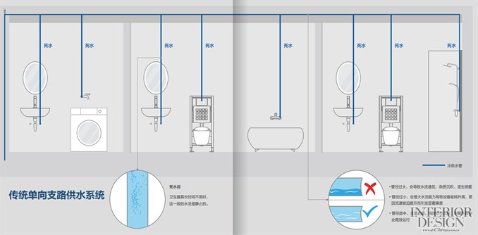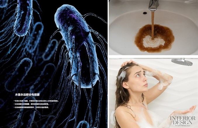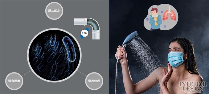 在当代中国的建筑给水系统中,绝大多数的传统水路设计仍是“单向支路”,就像是一条主干道上分支出来若干岔路,这样每个岔路下的末端用水设备未开启的情况下,这条支路就是“死水段”,成为现成的细菌培养皿。要知道据相关统计,一个150 ㎡ 的平层住宅,给水管道内存水量通常约为40升,而一栋500 ㎡ 的别墅,管道内存水量可能超过100升,如果出差一两周房子无人居住,别墅卫生间总有一两个不是经常使用,或是像度假屋、学校等有明显间歇性使用的物业里一两个月都无人用水,整个管道内的死水环境正是军团菌最喜欢的理想温床,而这并不是回到家后开水龙头放几分钟水就能解决的问题。