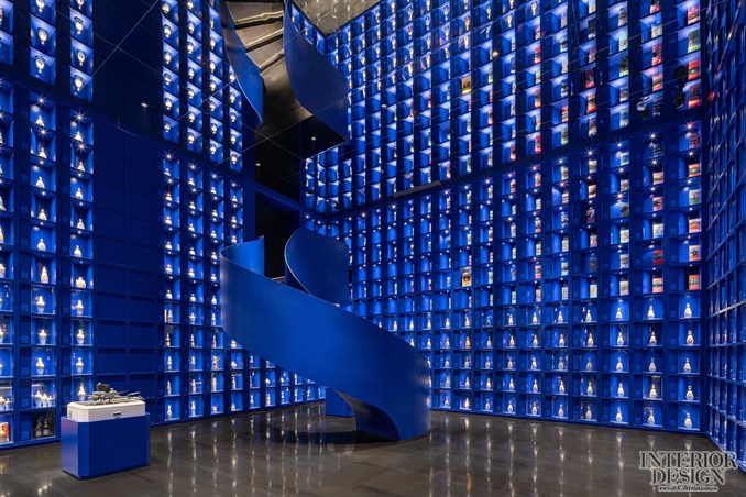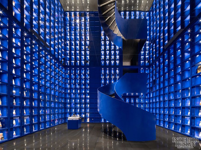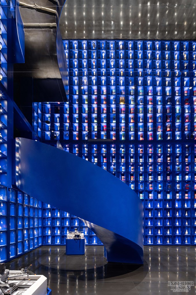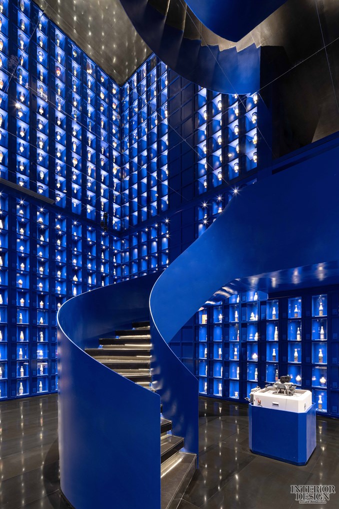 以图书馆为灵感,顶天立地的酒架成为了空间的主角,宛如浩瀚的星辰。设计师最终通过一个蓝色的矩阵空间和旋转楼梯实现了上下两个版块的空间转换与场景穿越,并将老酒陈列的视觉震撼实现了最大的冲击力度。