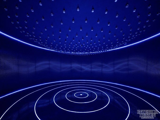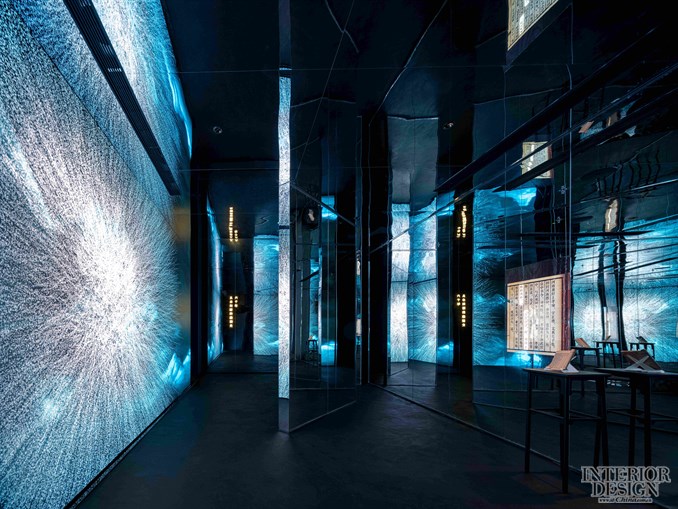 每一个小酒瓶都通过电脑编程精准控制上下移动,形成整体的韵律性节奏,并与地面灯带、墙面动态光韵和背景音乐形成集成联动,这既像是无数青花汾酒的时代共舞,更代表着科技的集成,品牌文化的艺术升华。