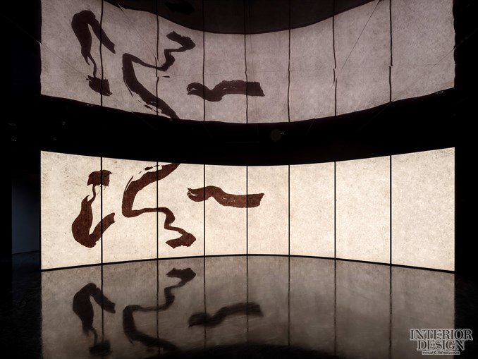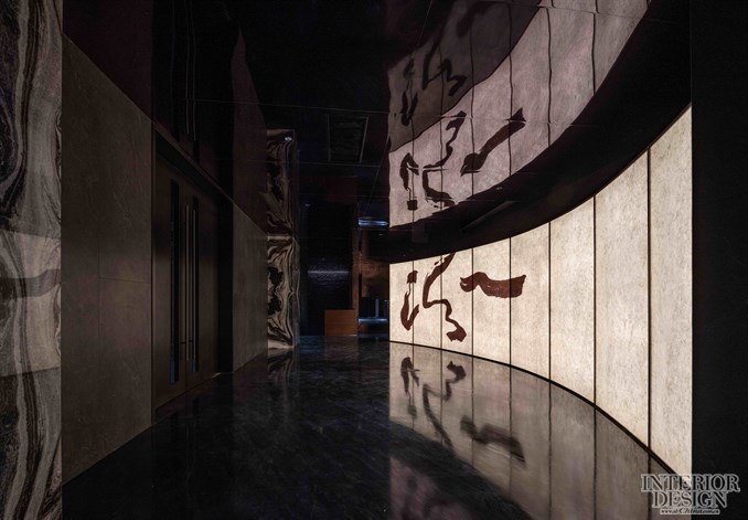 空间叙事的基调从门厅开始,一如迎面而来的草书汾字,透着耀眼的文化光芒与品牌自信。门厅以深色石材为基底,极简而安静,内敛的气场衬托者弧形的透光背景,如徐徐展开的一幅长卷,大量的留白与寥寥几笔笔墨形成了极具当代性的艺术张力。这是一个更开放更现代更艺术的汾,它即象征了河流山川,山西的表里山河,更代表的是汾酒来到了上海,在这个国际大都市,以数字文化博物馆的全新面貌,实现了一次新的升华、新的变局、新的超越。
