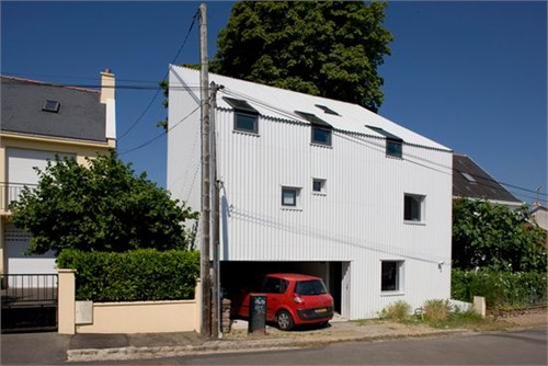 这个方案严格按照当地建筑规范进行设计,整体形式包含了一个两层通高的空间和一个向东面倾斜的屋顶。建筑外立面包裹了一层白色金属面板,这个不规则的体量与街道分离,向后腾出了一块停车区域,可以同时停放两辆车。临街立面上设计了一系列小方窗,有些一直贯通到屋顶形成别致的天窗。