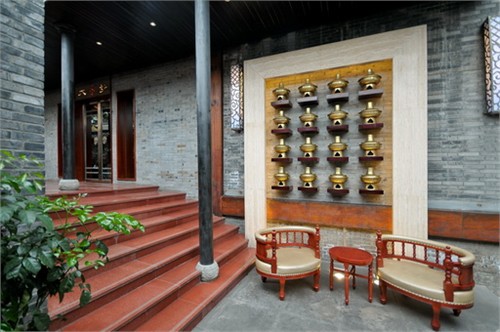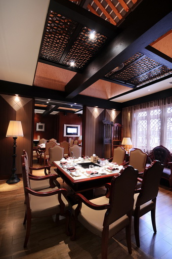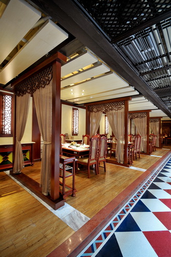 宽窄巷子是成都的一张名片,这里既汇聚了清末民初老皇城的记忆,又装点了当代成都的时尚。大妙火锅餐厅位于窄巷子的东头,2层半的建筑是新建的钢结构主体,仿旧制作的外墙。总建筑面积约1300㎡,设计开初对建筑空间重新进行了整理,形成了完整的围合式中庭空间,并在端景墙处加入了舞台的设计。设计主题融入了代表清末民初艺术的珐琅彩瓶的概念,从珐琅彩瓶中提取图案元素、色彩元素、造型元素来结合实际的用餐空间。主材以花梨木、红蓝白相间的人造石、艺术面的米色大理石为主,将材料在空间造型中运用当代的手法来演绎。