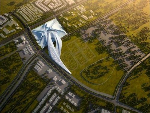 扎哈-哈迪德建筑事务所最初被雇用去设计整个项目,但这个合同——包括一个8公顷的文化和商业综合设施,加上23公顷的运动场和公园——在去年被修订,限制了扎哈-哈迪德对这个场地的总体规划的参与。城市规划者现在制定了设计阶段的征求报价方案,预期在今后两个月内公布。在2006年举行的竞赛中,扎哈-哈迪德从23个参赛者中被选择。当时埃尔克-格罗夫镇是美国增长最快的城市,并且希有一个地标性建筑与它的发展雄心相匹配。但经济衰退推迟了这个发展计划,仅是在市政厅选择扎哈-哈迪德分区计划之一前,这个发展计划才恢复。