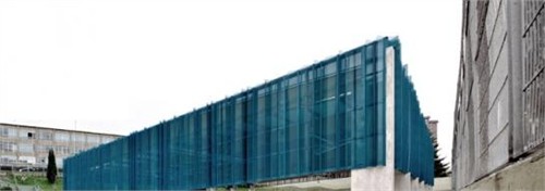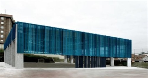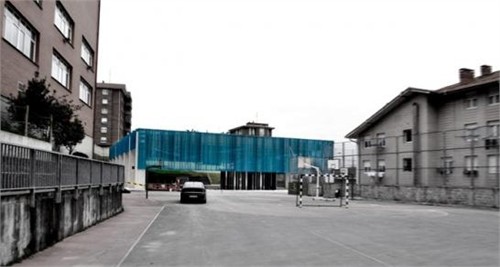 客户希望将学校里的游戏空间覆盖起来,并形成一个具有个性的存在。鉴于其标志性,以及各个方向吸引力的要求,设计师通过在混合结构的混凝土上搭横梁,架出了这么一个大跨度空间。外表皮是上漆的穿孔金属板,穿孔板过滤光线,使得新空间内部光线柔和宜人,非常适合使用。同时满足学校的要求,是一个小区域的标志物。设计方是Garmendia Arquitectos。