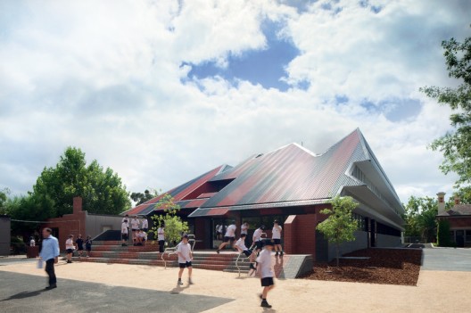 这个学校的设计是对独特城市条件的反映和探索,它是一个充满想象力的建筑,是一个向上延伸,向外突出的有切面的建筑,它的前立面堪称一个被诅咒的住宅,中心突出部分是一个神殿般的空间,建筑后侧则是高高的尖顶。设计的排布形成一个北侧的院落,这里有首层的教室,楼上的走廊被切换,从而减少对附近邻里的影响。首层的教室充满丰富的颜色但同时给人朴素的感觉,二层轻盈飘渺,整体形象如同一片云彩,是对附近教堂的极大呼应,高高翘起的烟囱是光的来源,同时也能为教室提供良好的通风。
