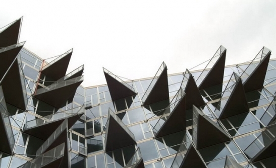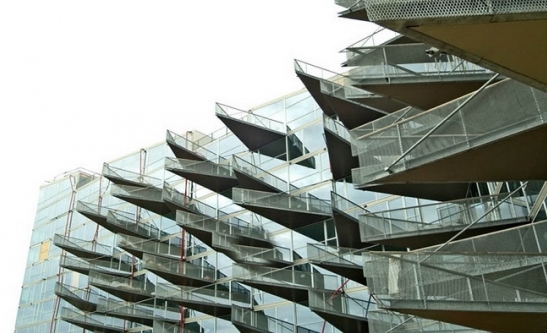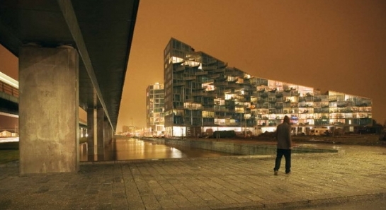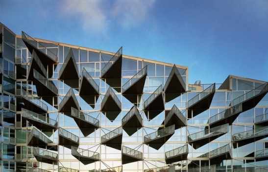 VM 大楼是两个字母 V 和 M 的形状组成的一个公寓住房,一个 V 形的建筑和一个 M 形的建筑相匹配,不是理性的审美情趣而是一个新概念的功能性为主的住房。VM 楼大胆的三角阳台,公寓的门面像刺猬的尖刺突起,使人造成强烈的视觉冲击。玻璃幕墙覆盖整个公寓,这使得室内就像一个洋娃娃的房子。然而,独特的三角阳台和 V 型和 M 型建筑物的安排并不是设计简单的视觉效果。凸出的阳台让充足的阳光进入每个家庭,并与相邻房屋的邻居提供最大的沟通空间。在这间公寓有各种单位,从单一的房屋家庭住宅,在65套房120m,每个房间具有独特的结构,方向和视野。与平常的公寓一样有相同的结构。公寓的住户单位的总数是230,他们有120个不同类型的平面图,复杂的组合,像拼图游戏。