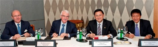 Guy Crawford, 卓美亚集团首席执行官,Gerald Lawless,卓美亚集团执行主席,以及PT亚太物业行政长官Sukowati Sosrodjojo,总监Kuntjoro Widodo在卓美亚巴厘岛酒店签约现场。