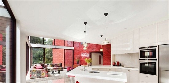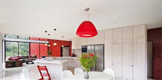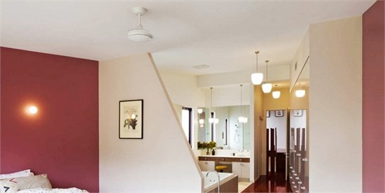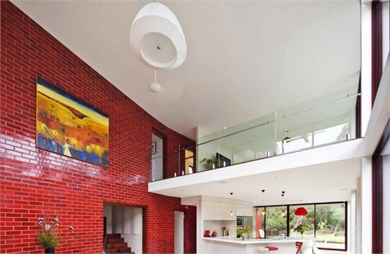 房屋的垂直流通通道是一道螺旋形的楼梯,它很巧妙地夹在两片“鱼鳍”中间,连接了全部五个楼层。 楼梯引着参观者穿过砖墙之中的门槛,以红墙作为隔板,走遍三个截然不同的功能区域。