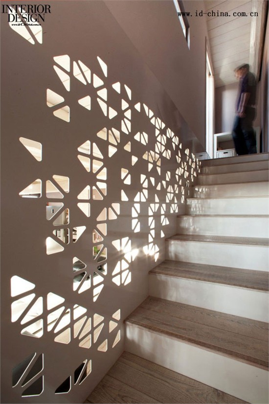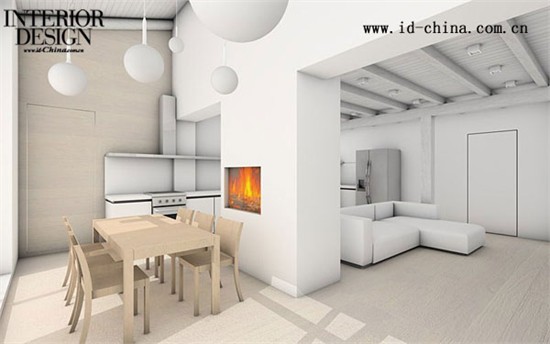眼前这间时尚的现代住宅,实际上是由意大利Ego Vitamina Creativa事务所将一间老旧的车库改建而成的。这座位于意大利北部城市库内奥的双层公寓被命名为Casa LD。公共区和私人区被雕塑楼梯分隔位于两层,贯通两区的则是相同的设计和色调。明亮优雅的一楼客厅/餐厅/厨房虽然被宽大的中间是透明壁炉的柱子分割,但这流线区域则在视觉上更显连贯。木质地板与木质天花板呼应,相同的设计似乎延长了透过玻璃门窗的光线。设计师用交织的线条打造出深色木质家具沿墙壁背对厨房而设的场景。这样的空间又可用作储藏,支撑着折叠喷漆穿孔的金属楼梯直达上层卧室。独特的公寓设计和地面布局经过细致安排还需要一个中心点才能获得有趣的室内空间。