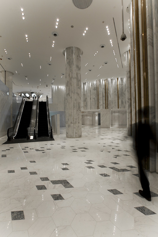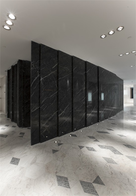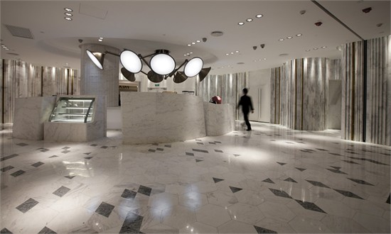 为配合白色主调及特显「白云」这个主题,戏院大堂的墙壁以一片片云石砌出帘幕形状营造出无穷空间感,让人有如置身于天空中,眼前所看到的云石「白云」—它的雪白、形状的神似,让人不禁啧啧称奇,深刻感受到「白云」那无特定形态、开扬广阔、无限想像的意境。同时,除了大堂及影院走廊,售票处同样设有折叠式「云石帘幕」,整个项目主题清晰明确统一。而地下六角型的白色云石面上,有零碎三角型及菱型灰云石,营造了有层次的浮云境界。站在上面有如身处在浮云上,随便找个角落就能望到地上的世界会是怎样。设计师特意使用镜钢制作天花,透过镜面反映出售票处的倒影,有伸延的作用,更加强了漂浮的感觉,完美贯彻项目的主题。