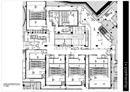 走到卖品部,中央内有几盏大型的圆型射灯,让人有如置身于片场当中的感觉,让观众更能投入于电影的世界当中;同样地,售票处的弧形线条与波浪型设计表达了随意、不受限制拘束、容纳不同的特色意象。