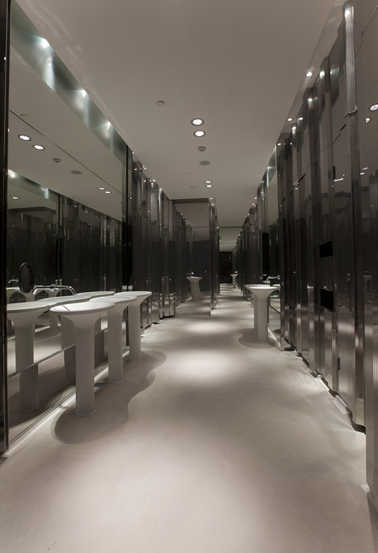 洗手间,设计师选用条状的不锈钢镜面墙身,不单增加了其空间感,更透过镜面材质反映出「光」与「影」的效果,与电影世界有着强烈的牵引。另一吸引目光的地方就是那些特别设计的洗手盘,设计师选用了云石并将之制作成白云的形状,不单切合整间戏院的主题,更增添了新颖及现代的感觉。