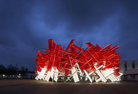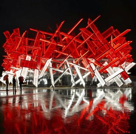 这座展台用了200多块红色和白色的充气ETFE块组成。它们相互堆叠在一起,构成了一个带突起的鸟巢结构,里面便是主要的展览空间。由Mark Ronson和Katy B录制的可口可乐公司奥运主题歌曲“世界的任何角落”(Anywhere in the world)将在展台上播放,而ETFE块里边嵌入的交互式传感器和灯光照明等将会与参观者互动。