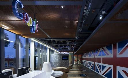 在接待台的上方,谷歌的标记用微小的灯光下来闪现,为谷歌工作区的创新设计增加了一点有趣的氛围。工作区面积为16万平方英尺,是Penson事务所为谷歌设计的第二座办公楼,先前他们还给谷歌的工程部设计过办公室。除了接待台之外,这里还有图书馆、体育馆、咖啡馆和餐馆等,都可以一览伦敦天际线的景观。