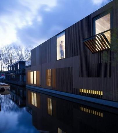 该项目是由Framework Architecten和Studio Prototype共同设计的位于阿姆斯特丹的一个住宅项目,住宅外部呈现出由木质棒体组成的特殊几何形式。住宅漂浮在一个船上,而这个船停靠在城市西南侧一个运河上,所以被称为水别墅。它包含一个低于水面的下沉层次,一个位于住宅中心的中庭连接地下的儿童房间与首层的起居和餐厅,也与二层的卧室及书房连接。木质表皮间狭窄的空隙展示出玻璃门及窗户的位置,顶层的一个窗户还包含远程遥控木质百叶窗,它能随意开合。