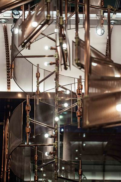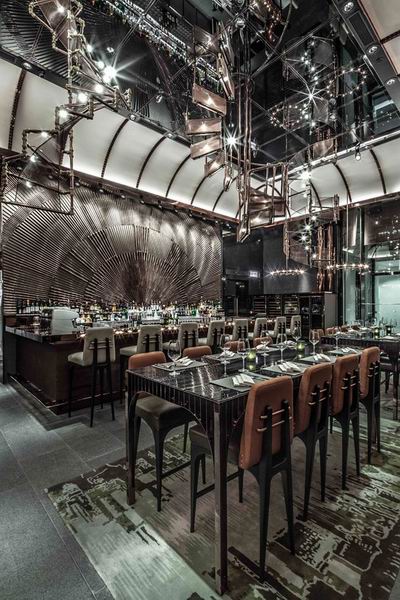 香港金钟的一座前英军军火库,内部经设计师 Joyce Wang 精心改造,用子弹、铜管制成墙身,并特别设计旋转铜梯及丝网钢筋镶嵌的吊灯,呈现出一间机械感十足的创意餐厅。