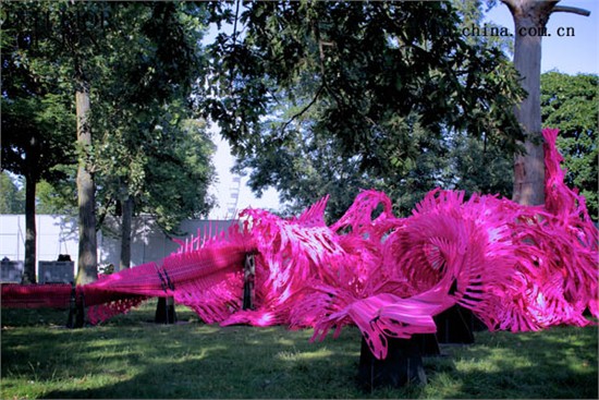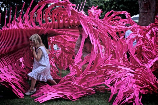 “绽放”与其说是艺术装置,不如说是城市玩具更贴切。分布式社交游戏,聚集式“园艺”体验,人们在互动中找寻乐趣。设计师Alisa Andrasek和JoseSanchez 提供大量组合单元片,人们将单元片组合拼接,组成长凳,帐篷等。“绽放”的能力来自人们的互动。单元片具有高灵活度和柔韧性,游戏规则也自适灵活,人们也因此可任意解读作品...天鹅,兔子或是飞船?“绽放”以奥运官方粉色亮相,庆祝2012伦敦奥运会和残奥会。