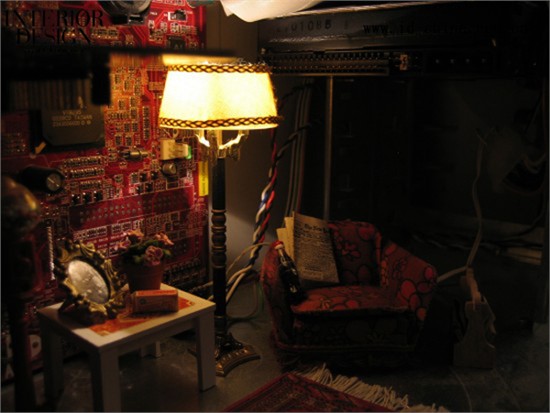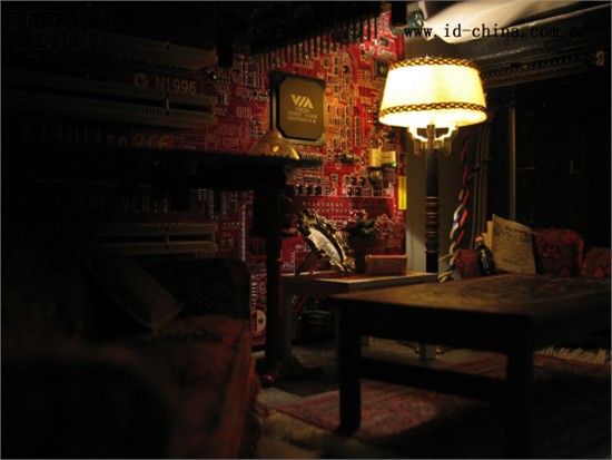 见过这样的客厅吗?计算机机箱里隐藏的世界,也许是世界上最小的客厅。这是来自俄罗斯的“计算机微型客厅”,在计算机小小的机箱里,摆设着小巧可爱的玩具家具,舒适的长沙发,单人沙发,甚至一盏通过机箱电源通电的小小的落地灯。仔细观察,还会发现更多有趣的细节,比如口香糖机,倚在单人沙发上的瓶装可乐和纽约时报,小小的织物地毯,桌上的盆花。温馨的灯光映照电路板墙纸,是不是很想变小走进去看一看?