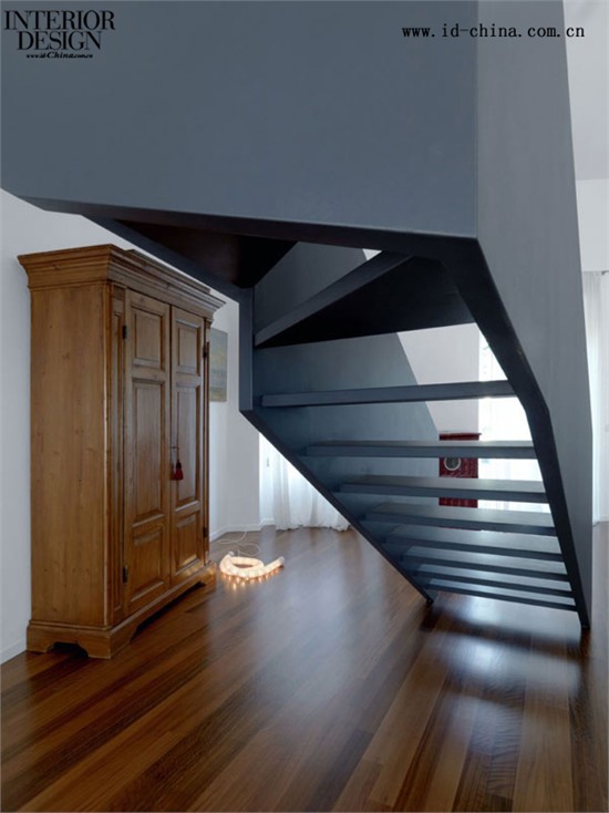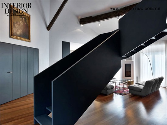M2住宅内这座深黑色木质楼梯,连接室内空间通向阁楼。由意大利Bettinelli 设计事务所完成,这座楼梯将室内垂直空间延伸,宽大的木质结构作为上下空间的通道,直通阁楼,深色稳固,连接两层室内空间。可以在意大利贝加莫发现这一创意建筑方案,公寓底层不仅因此得到更多优雅空间,也打造了延伸舒适空间的loft。