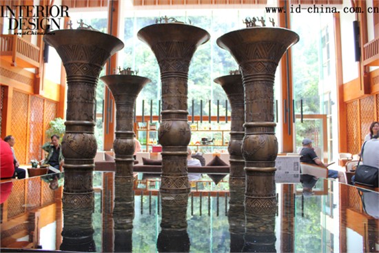 大堂的中心位置是极具民族特点的火塘,上面雕刻着反映瑶族人们生活、娱乐中的一些场景,观赏它,就象观赏瑶族人生活发展的历史年轮。据说火塘是瑶族人们日常生活活动的中心,又是瑶族人精神的载体,是民族的象征之一。大堂四周上空的“看台”,以瑶家传统吊脚楼形式,用现代的手法进行演绎,加强了舞台戏剧化效果,再加之设计了投影技术和鼓天幕而结合营造的休闲氛围,让此空间又呈现出现代而时尚的一面。