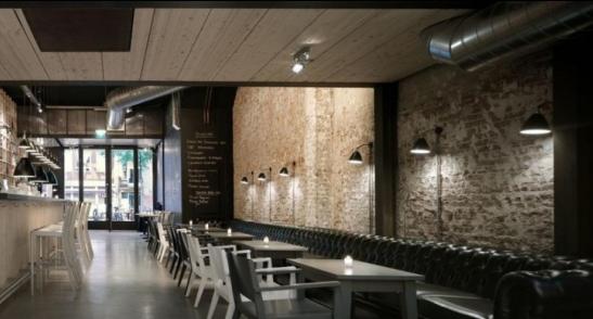 这是荷兰阿姆斯特丹Mazzo餐厅,设计师将狭窄,纵深的空间融合在一起,并结合尺寸狭小的桌椅板凳将空间实现了最大视野炼骨的分割,试图通过这个方面布置 调节促进就餐人员的快速流通,增加客流量和商品转卖的速度。