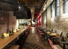 位于悉尼的这家墨西哥Mejico餐厅,整个空间不论是硬装还是软装都呈现一种令人躁动的冲动,不论是墙面或是地面都布满了涂鸦,红与黑贯穿整个空间,整面红黑相间的条纹墙带来强大的视觉冲击力,红和黑色的椅子也在相呼应,空间同样用到了木质材料,配上独特的吊灯, 整个空间充满激情。