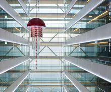 SANA饭店集团在葡萄牙里斯本的滨水地带建造了一座187间客房的豪华饭店。这座名为“Myriad”的饭店有两个标志性的风帆结构,中部有一座垂直的透明中庭,将光线散射到内部,并且能够让人们欣赏到海边的景致。从70米高的天花板挂下来的吊灯很像是一只水母,坐在全景电梯里的客人会有种身在海底世界的感觉。